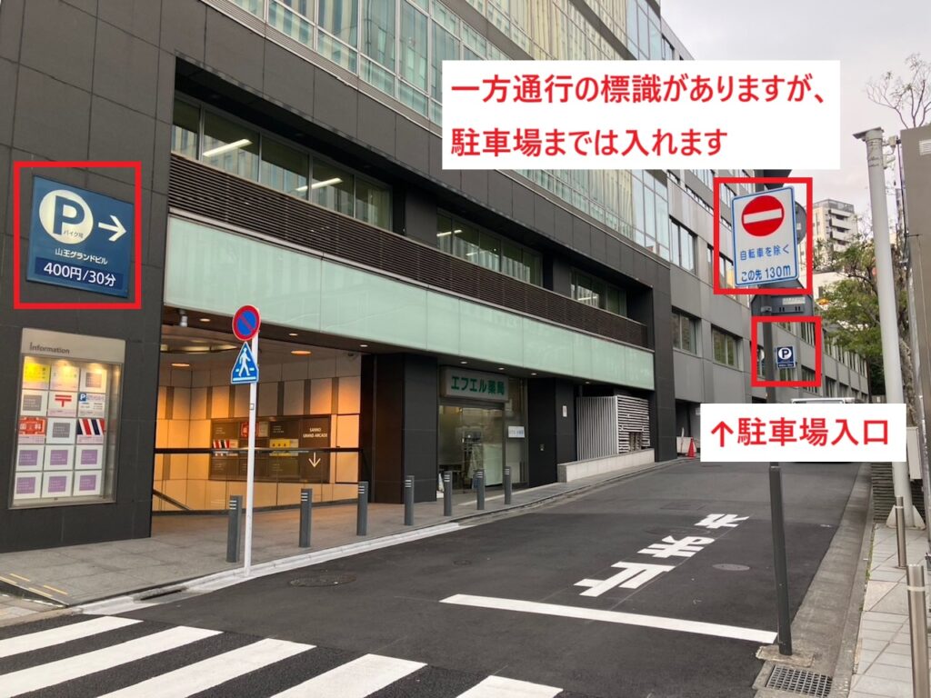 ビル前交差点を新坂方面(赤坂見附駅11番出口・山王グランドビル間の道)へ進みますと、駐車場入口がございます。
