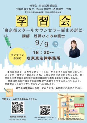東京都のスクールカウンセラー(SC)が2024年度採用において250名、事実上「雇止め」され、これに納得できなかったSCが、東京都と同教育委員会を相手に地位確認等を求める訴訟を提起しました。 弁護団所属の弁護士が訴訟の概要や運動づくりで工夫していること、弁護士としてのやりがい等についてお話します。
